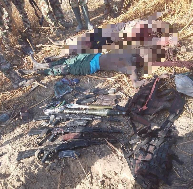 A post-battle exploitation of the area confirmed the neutralisation of six terrorists and recovery of the following items: Five AK-47 rifles; Eight AK-47 rifle magazines; 258 rounds of 7.62mm x 39 ammunition; Five RPG bombs; Four armed drone bombs; Five 36-type hand grenades; Two bandoliers and One Android phone